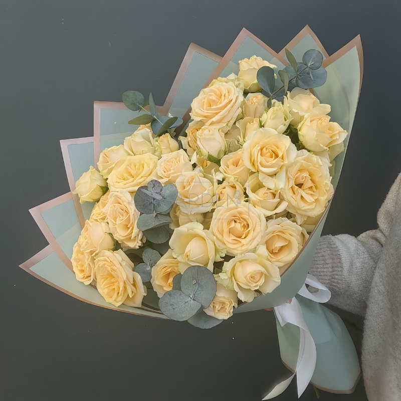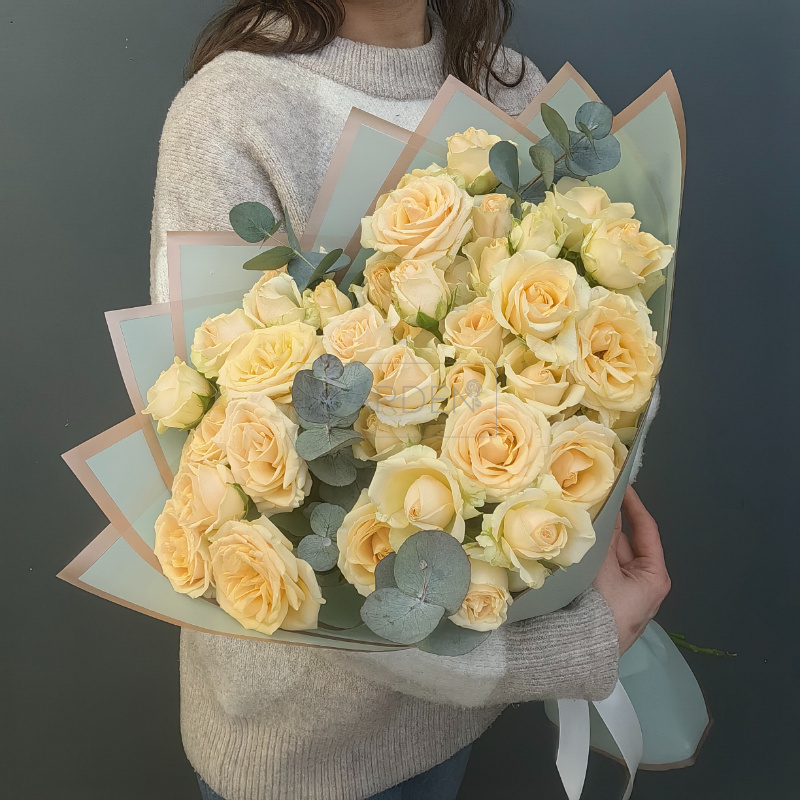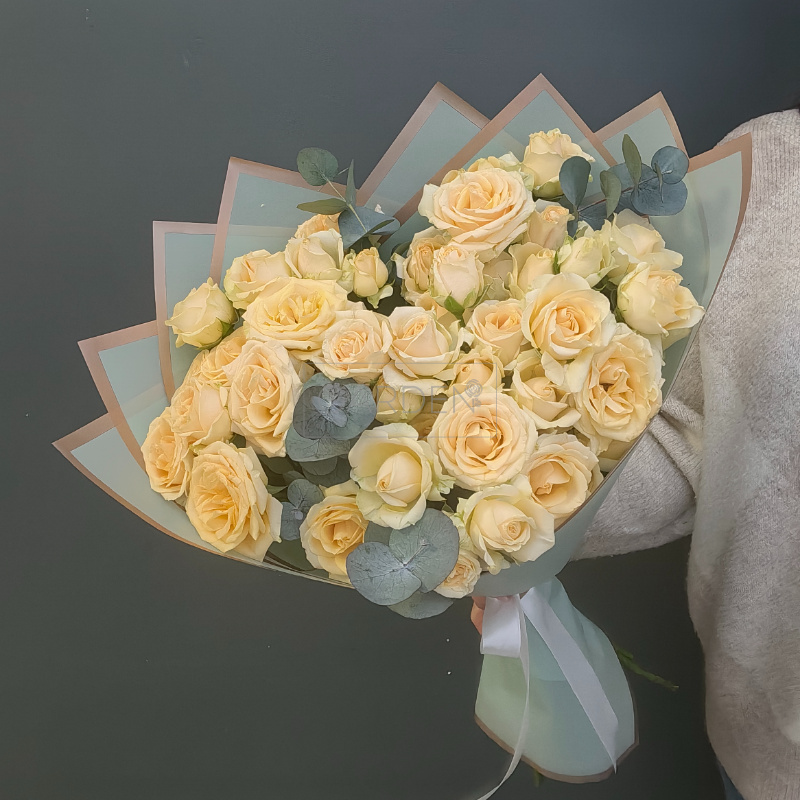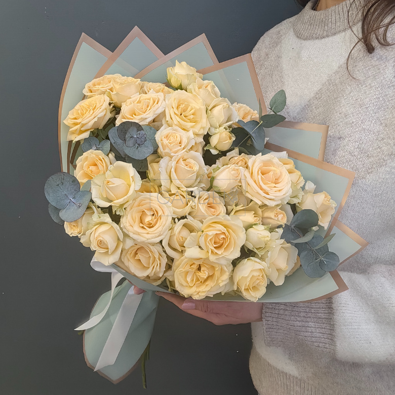 Стильный букет из кустовых роз с эвкалиптом — идеальный комплимент для ваших близких